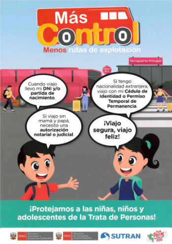 "Más control, menos rutas de explotación" es una campaña informativa en formato de volante y afiche, impulsada por el Gobierno, que promueve el control del traslado de menores de edad con el fin de proteger su seguridad y prevenir situaciones de riesgo durante sus desplazamientos.
